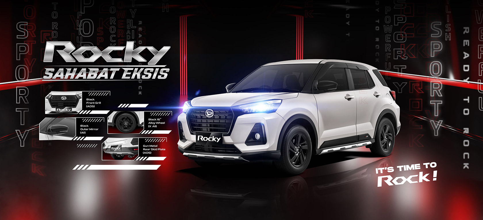 Sebagai kendaraan dengan tagline Sahabat Eksis, Daihatsu Rocky berikan penyegaran pada sisi eksterior, khususnya varian ADS dengan mengusung konsep mobil SUV Compact yang modern, active, dan sporty. Adapun ubahan penyegarannya dengan hitam meliputi area grill bagian depan, bodi spion samping (outer mirror), serta Black Alloy wheel 16’ inch untuk varian 1.2 X dan juga Gun Metal Skid Plate yang membuat semakin memberikan kesan yang sporty.