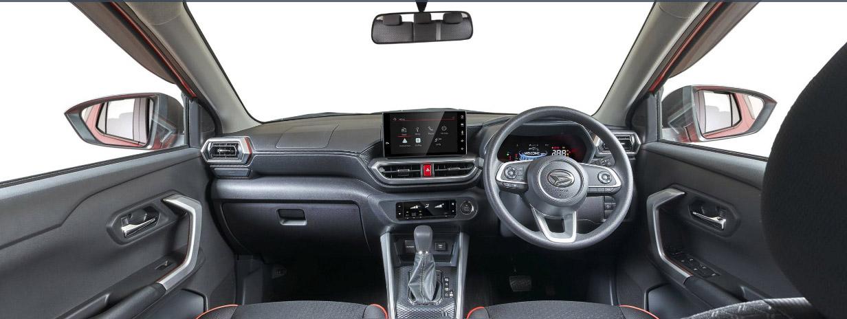 Pada bagian interior, dashboard Rocky berdesain cockpit dengan nuansa modern, serta meter cluster Rocky didesain menggunakan teknologi Full Digital dengan 4 mode tampilan yang dapat dipilih sesuai dengan style dan selera Sahabat. Rocky juga dilengkapi touchscreen audio berukuran mulai dari 7 & 9 'inch tergantung varian yang dipilih dengan konektivitas ke smartphone, dapat mendukung ekspresi penggunanya melalui berbagai hiburan yang asik.