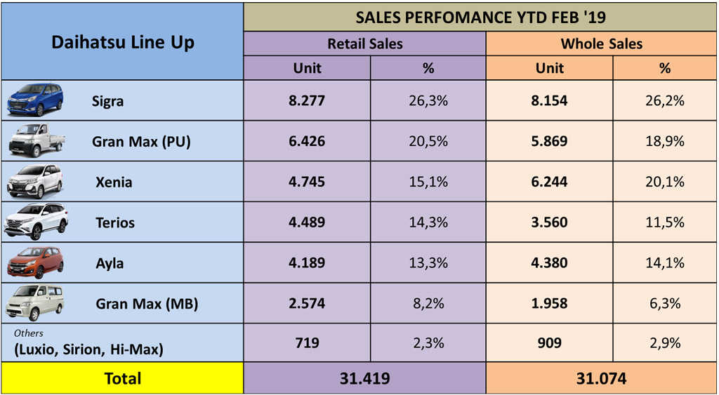 Penjualan retail sales Daihatsu didominasi Sigra dengan 8.277 unit, berkontribusi sebesar 26,3%. Diikuti oleh Gran Max (PU) 6.426 unit (20,5%), dan Xenia 4.745 unit (15,1%). Kemudian disusul oleh Terios 4.489 unit (14,3%), Ayla mencapai 4.189 unit (13,3%), dan Gran Max (MB) 2.574 unit (8,2%). Untuk line-up Daihatsu lainnya, yakni Luxio, Sirion & Hi-Max, mencapai 719 unit (2,3%).