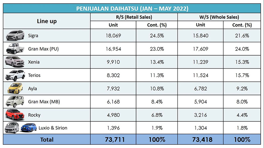 Secara volume dan kontribusi model, penjualan ritel Daihatsu tetap didominasi oleh top 3 model, seperti Sigra sebanyak 18.069 unit, atau berkontribusi 24,5%; disusul Gran Max PU (Pick Up) sebanyak 16.954 unit (23,0%); dan Xenia dengan raihan 9.910 unit (13,4%).